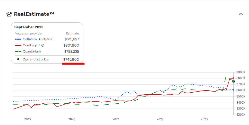 Here you can find almost all the information you need. We can see that this property is listed for $749,900, but under the “Home Value” tab, the estimated market value is $710,200, with a potential selling range of up to $746,000.